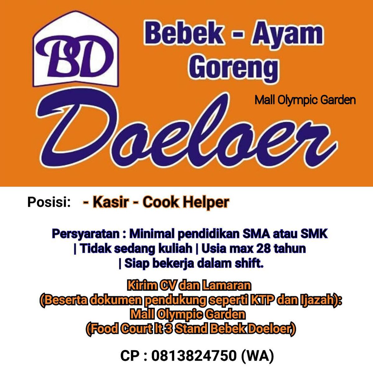 Ig Lokermalang On Twitter Lokermlg Loker Bebek Doeloer Mog 1 Kasir 2 Cook Helper Kirim Cv Dan Lamaran Ke Food Court Mog Lantai 3 Stand Bebek Doeloer Atau Email Ke