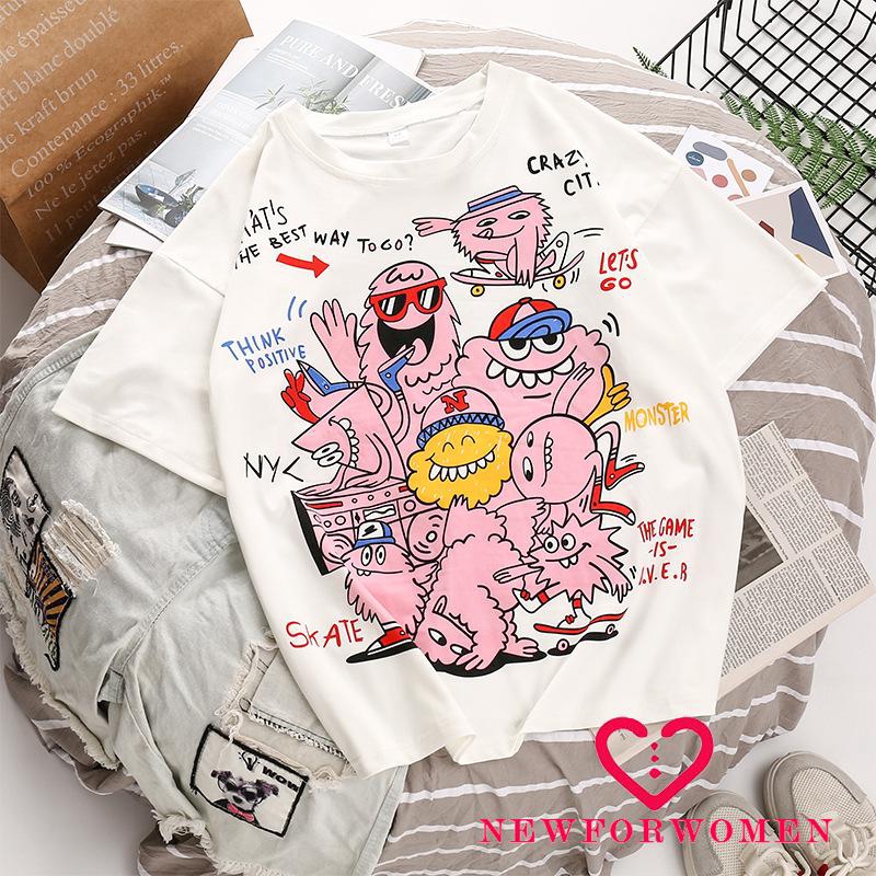 Nfw Women S Summer Short Sleeve Blouse T Shirt Tops Girls Round Neck Cartoon Graffiti Print Loose Shopee Indonesia